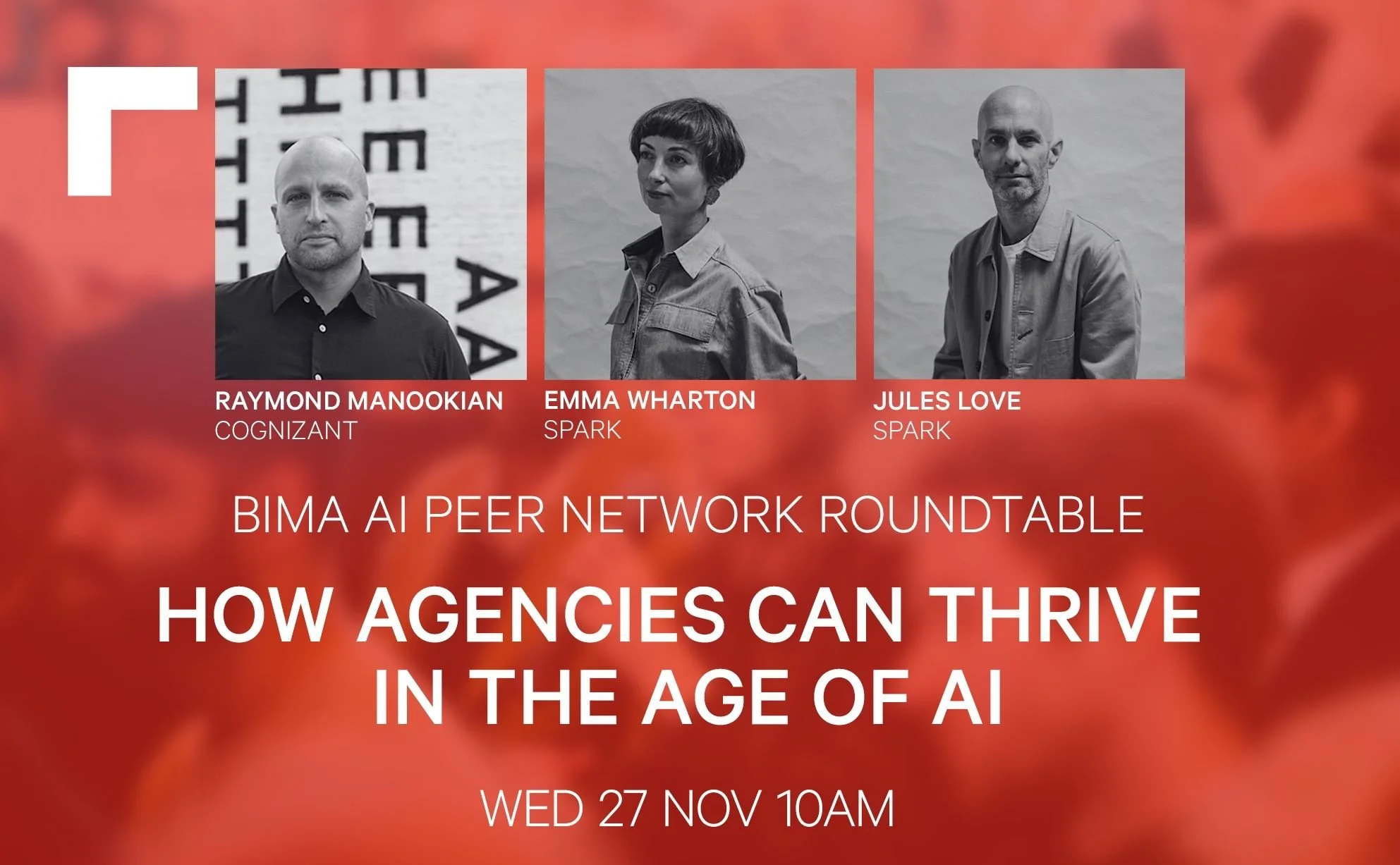 Join our co-founders Emma and Jules at the BIMA (British Interactive Media Association) AI November roundtable, hosted by Raymond Manookian. We’ll discuss how agencies use AI to drive innovation, redefine the creative process, and stay ahead.